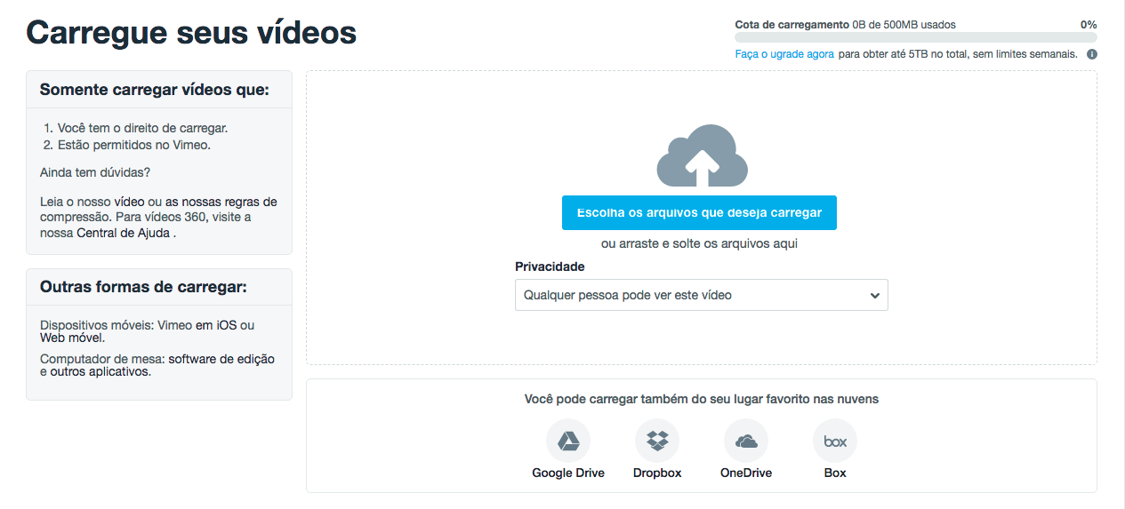É bem simples carregar seus vídeos no Vimeo. Após efetuar seu cadastro na plataforma, faça seu login e logo abaixo da sua página inicial terá um botão escrito ‘Carregar um vídeo’, clique.