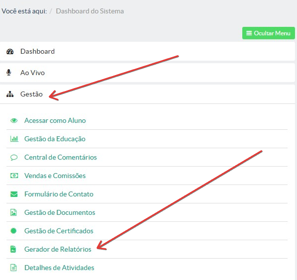 Acesse seu painel administrativo Maestrus > menu Gestão > opção Gerador de Relatórios.