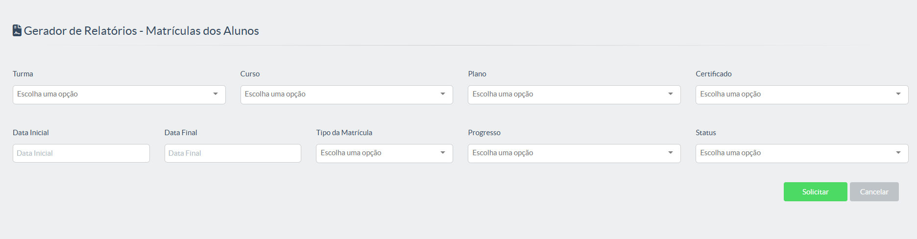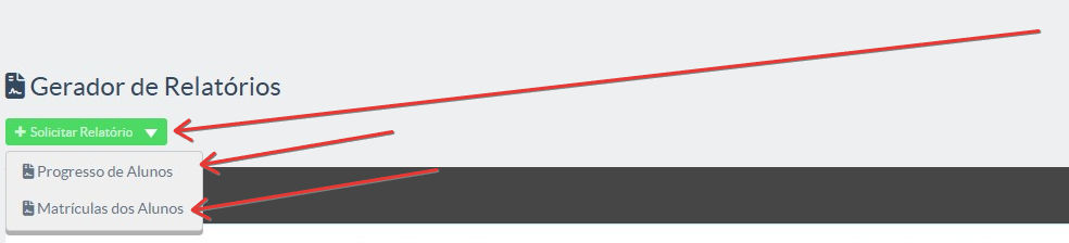 É possível gerar 2 tipos de relatório: "Progresso de Alunos" e "Matrículas dos alunos".