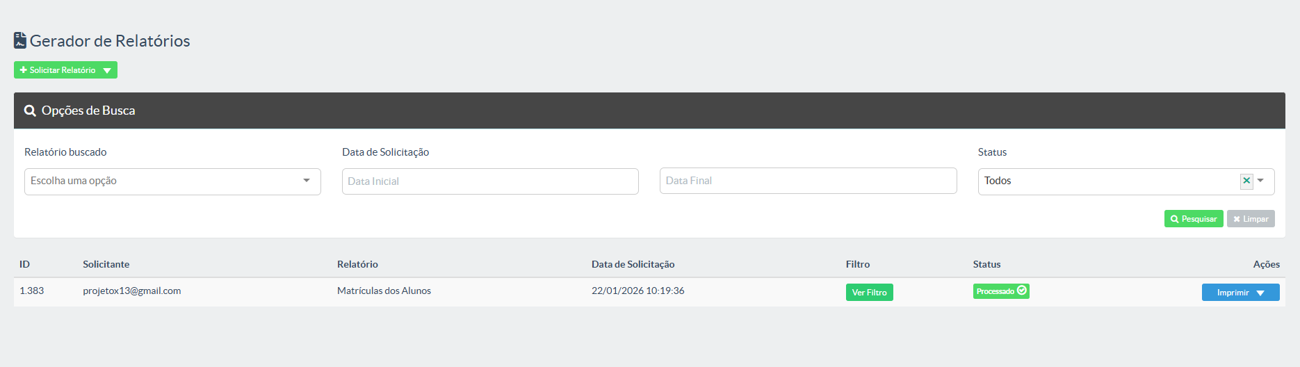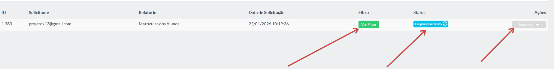 - Na coluna "Ações", a opção de 'Imprimir" só estará disponível depois que o relatório tiver terminado seu processamento.