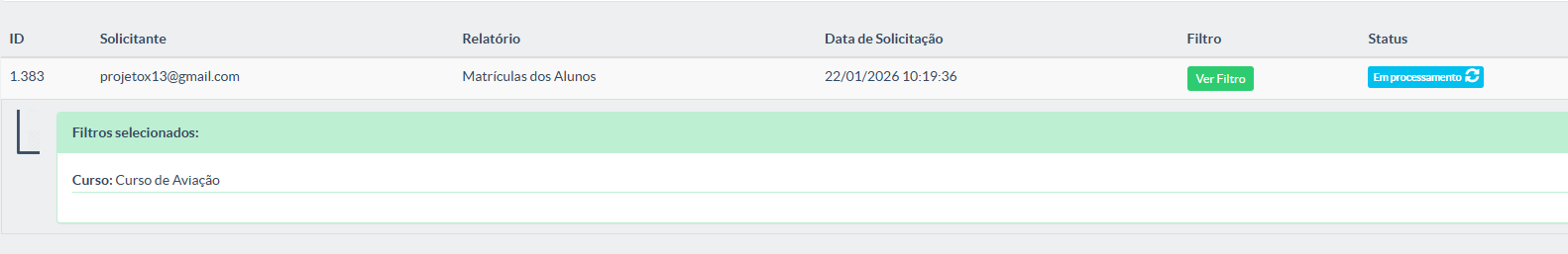 - Na coluna "Status" enquanto o relatório estiver sendo construído, lhe será mostrado o label "Em processamento".